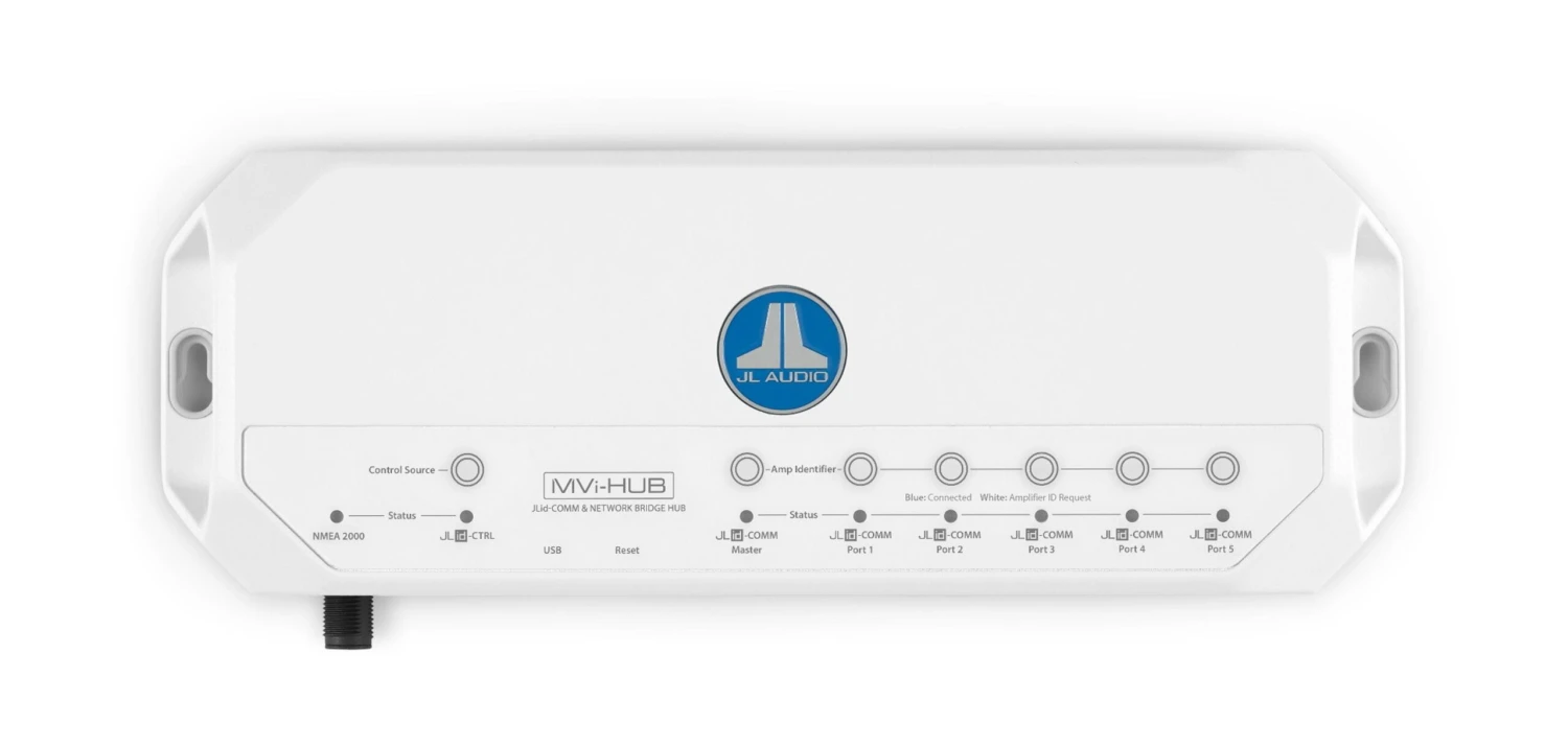 The MVi-HUB includes JLid-COMM ports to connect up to six amplifiers (one “Master” MVi amplifier and up to five “Slave” MV or MVi amplifiers) using standard CAT5e cables, allowing users to quickly switch between amplifiers during the tuning process, without disconnecting and connecting multiple cables.