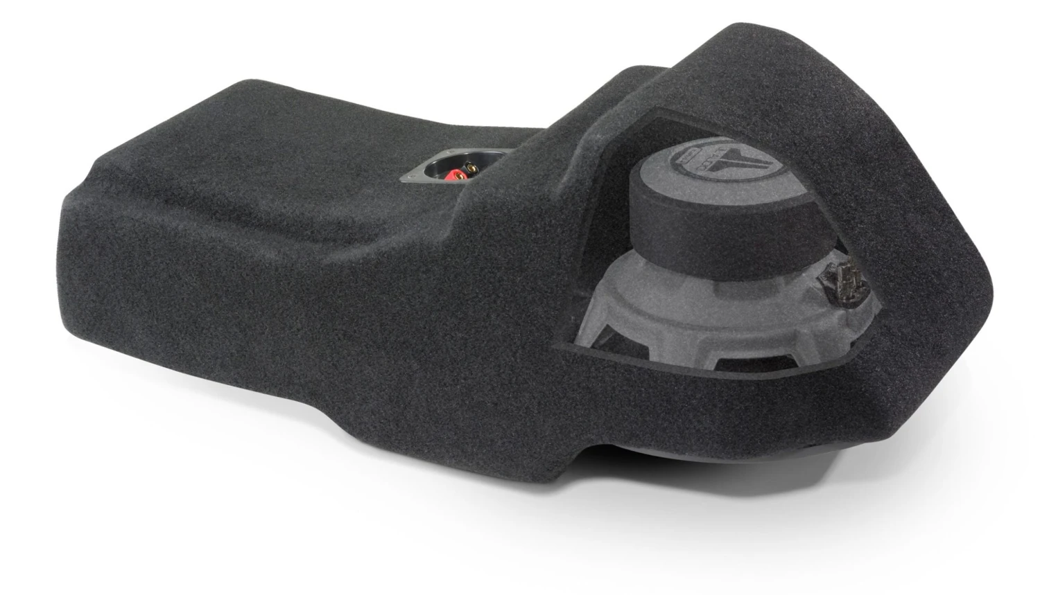 This compact unit installs inside of the factory center console for a completely stock appearance and delivers intense bass output and quality from a down-firing 10-inch subwoofer. Full console functionality and storage space is retained.